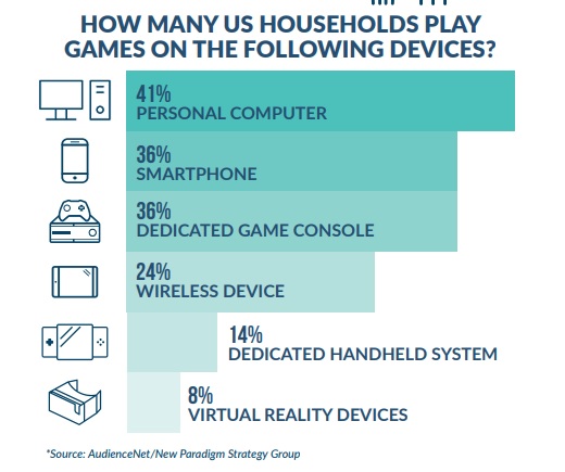 وما يقرب من 65% من البالغين في الولايات المتحدة أو أكثر من 164 مليون شخص يمارسون ألعاب الفيديو. وأكثر الألعاب شعبية هي البسيطة في قواعدها حيث يلعب 60% من عشاق ألعاب الفيديو على الموبايل على الرغم من أن نصفهم يلعبون أيضا على أجهزة الكمبيوتر الشخصية وأجهزة الألعاب المتخصصة.