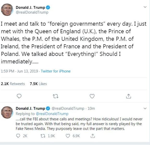 وفي إشارة إلى زيارته الأخيرة إلى المملكة المتحدة، كتب ترامب على تويتر تغريدات متتالية: “أقابل وأتحدث كل يوم مع حكومات أجنبية”.