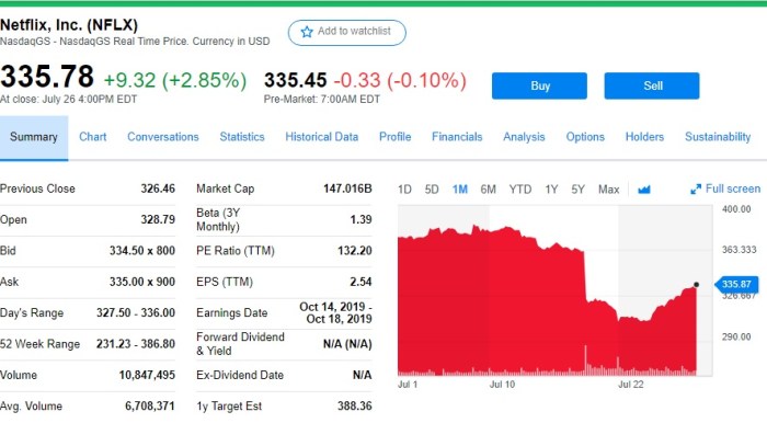 مؤشر يظهر الأنخفاض في سعر سهم شركة نتفلكس نتيجة النتائج المخيبة للآمال في الربع الثاني من عام 2019