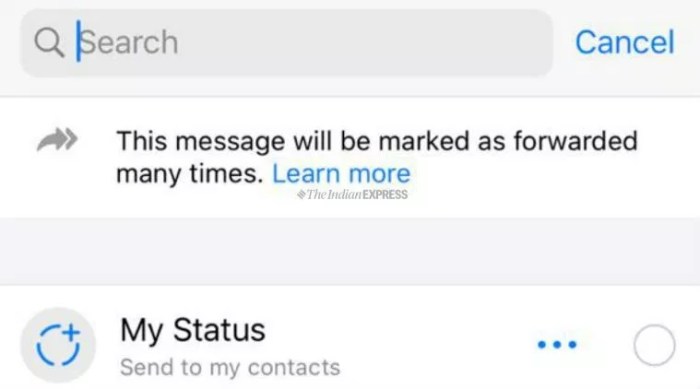 إذا كان أحد المستخدمين يحاول إعادة توجيه رسالة تمت إعادة توجيهها عدة مرات من قبل ، فسيقوم واتساب بإعلام المستخدمين بأنه سيتم تعليمها على أنها “تم إعادة التوجيه عدة مرات”