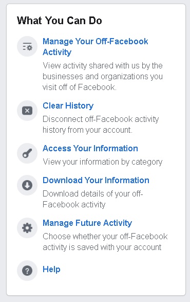 وتتيح هذه الميزة للمستخدمين رؤية البيانات والتحكم بها التي تشاركها التطبيقات والمواقع الإلكترونية الأخرى مع “فيسبوك”، ويمكن للمستخدمين إزالة تلك المعلومات وفك ارتباطها مع “فيسبوك”، بالإضافة إلى القدرة على منع موقع التواصل الاجتماعي الشهير من الوصول إلى جميع الأنشطة التي يقومون بها خارج شبكته.