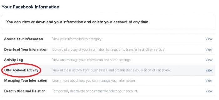 توجد خاصية Off-Facebook Activity مع الخصائص Settings وسوف تجدها في القائمة الفرعية في الجزء الخاص بمعلوماتك علي الفيسبوك “Your Facebook Information”.