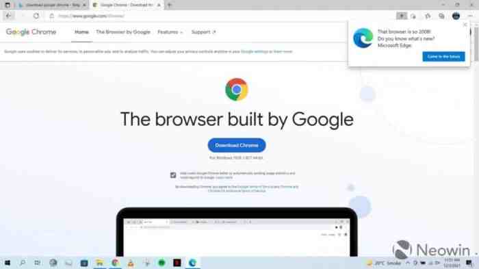 وقامت مايكروسوفت بالسخرية من متصفح جوجل كروم مؤخرًا في تحديث جديد لمتصفحها إيدج، حيث كانت تعرض رسالة ساخرة عندما تحاول تحميل كروم.