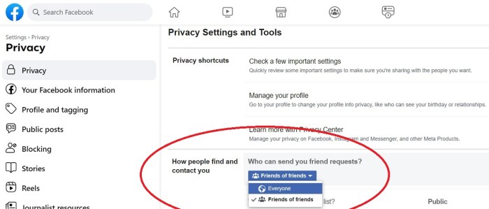بشكل افتراضي، يضبط فيسبوك ملفك الشخصي Profile بحيث يسمح للجميع بإرسال طلبات صداقة إليك ولكن يمكنك أن تحد من طلبات الصداقة في محيط الأشخاص الذين قد تعرفهم من خلال أصدقاء الأصدقاء فقط. إليك الطريقة: