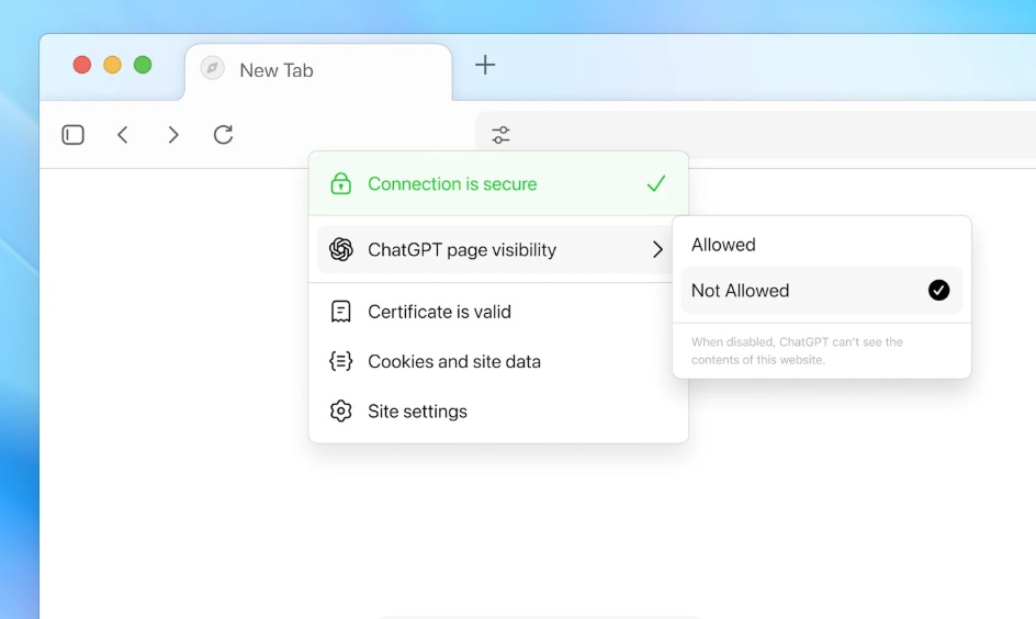 يمكنك عرضها جميعًا في الإعدادات، وأرشفة تلك التي لم تعد ذات صلة، ومسح سجل التصفح لحذفها. حتى عند تشغيل ذاكرة المتصفح، يمكنك تحديد المواقع التي يمكن لـ ChatGPT رؤيتها أو عدم رؤيتها باستخدام زر التبديل في شريط العنوان. عند إيقاف تشغيل الرؤية، لا يمكن لـ ChatGPT عرض محتوى الصفحة، ولا يتم إنشاء أي ذاكرة منها.